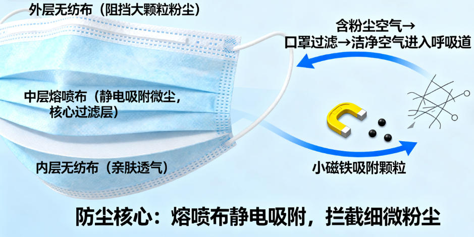 工业防尘口罩一般由内外两层无纺布,中间一层过滤布,也就是熔喷布构造而成。这中间的熔喷布可是关键所在,它具有本身带静电的特点,这就好比一个小小的磁铁,能够吸附体积极小的微粒。当含有粉尘的空气通过口罩时,粉尘颗粒就会被熔喷布上的静电吸附住,从而阻止粉尘进入我们的呼吸道。这就像是一个过滤器,把空气中的粉尘杂质都过滤掉,只让干净的空气进入我们的肺部。