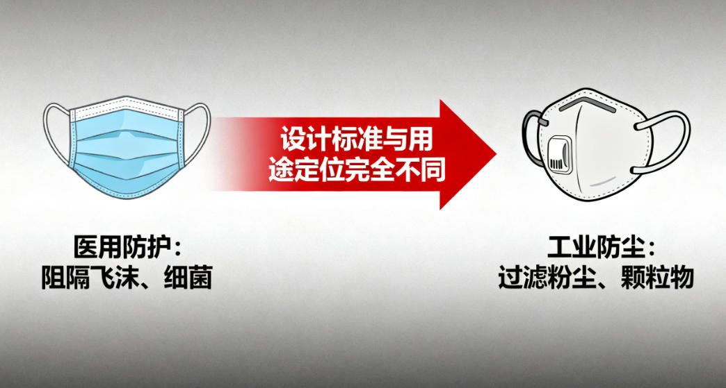 医用口罩的设计初衷是防菌防飞沫,而非防尘。 将其用于防尘,尤其是职业性粉尘防护,会因面部密合性严重不足和过滤效率可能不达标而存在巨大的健康安全隐患,可能导致尘肺病、哮喘等严重职业病。