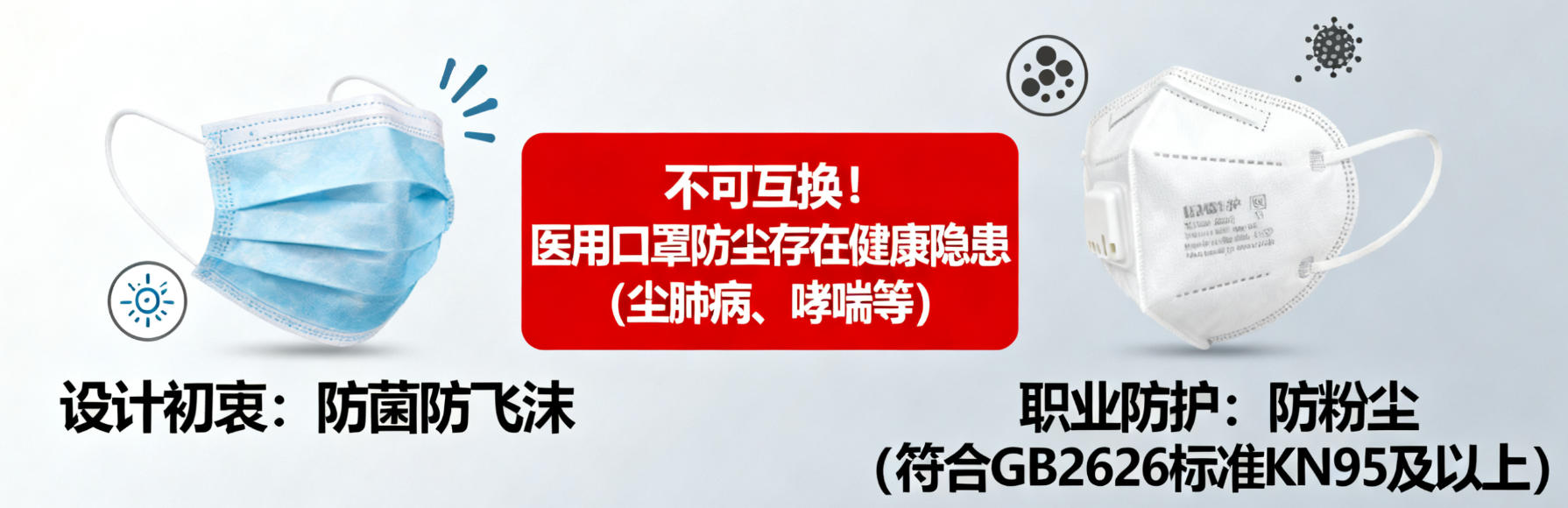工业环境(木工、采矿、建筑粉尘) | 极高 | 绝对禁止使用医用口罩! 必须根据作业环境粉尘浓度和性质,选择符合GB 2626标准的KN95、KN100等级防尘口罩,并确保佩戴密合。 |