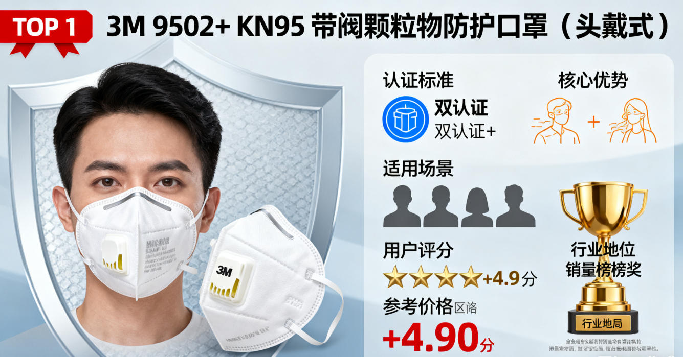 第1名:3M 9502+ KN95 带阀颗粒物防护口罩(头戴式)