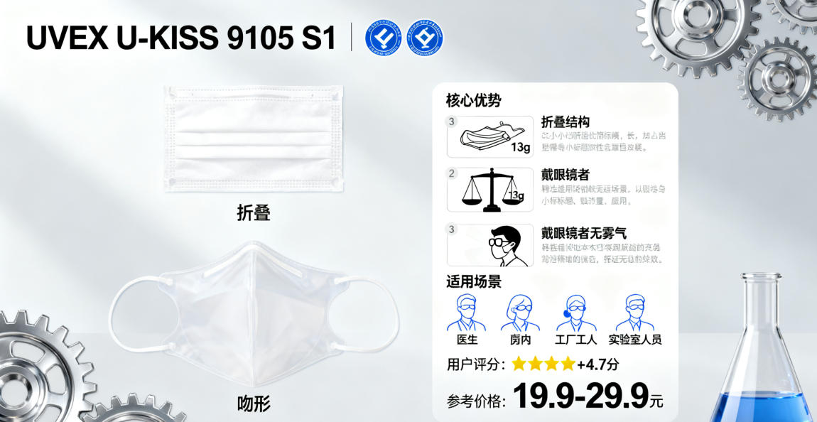 第4名:UVEX U-KISS 9105 S1 KN95 折叠式防护口罩