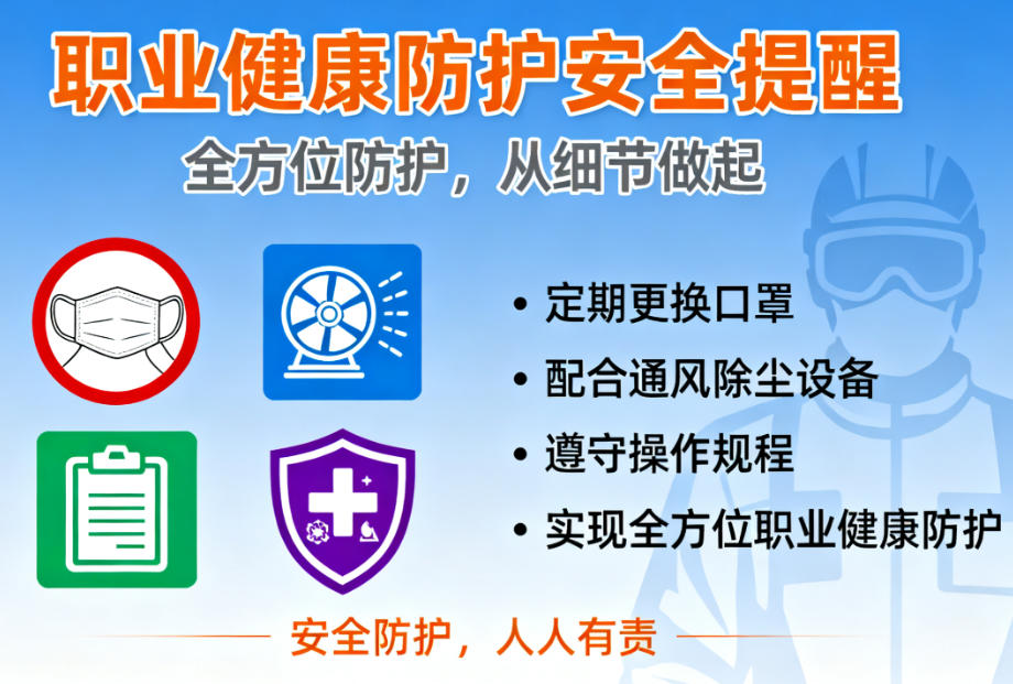 安全提醒:定期更换口罩,配合通风除尘设备,遵守操作规程,才能实现全方位的职业健康防护。