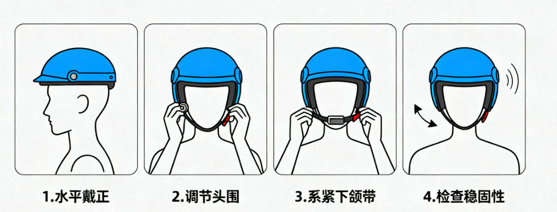 检查稳固:左右轻推,头盔不应滑动或脱落