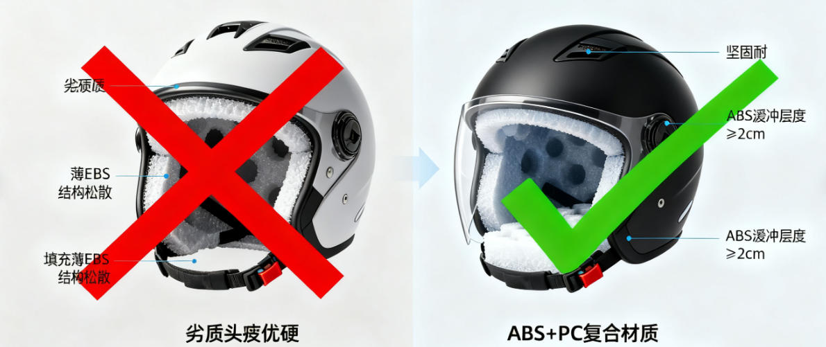 ❌ 以前那种“塑料壳+泡沫”的“装饰性头盔”已经不合规了。
