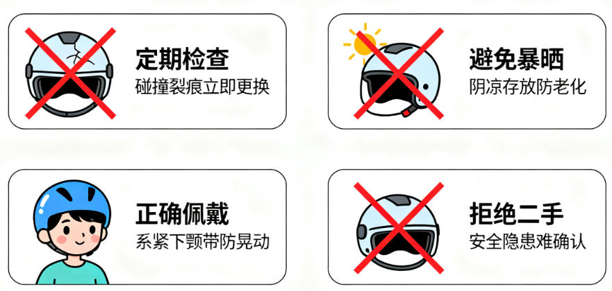 定期检查头盔状态:若发生碰撞或出现裂痕,需立即更换;