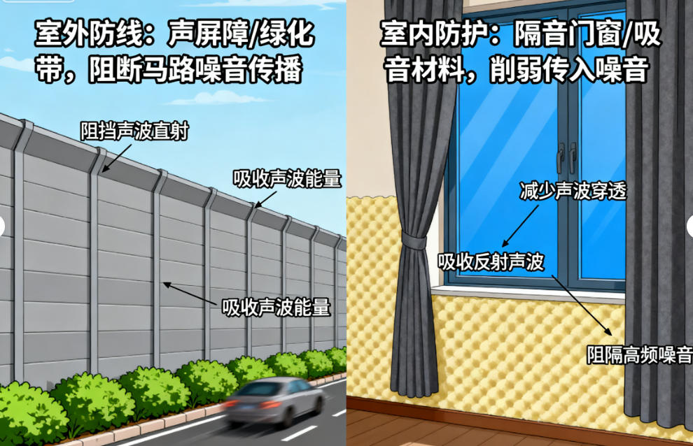 室外的噪音,比如马路的汽车声、工厂的机器声、铁路的火车声,最有效的阻断方式就是“建隔音屏障”——就像给噪音“设一道墙”,让它过不去。