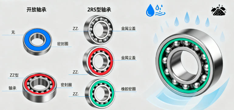 密封方式决定轴承的防尘防水能力与维护需求,直接影响轴承的使用寿命(污染是轴承失效的首要原因,占失效总量的40%)。