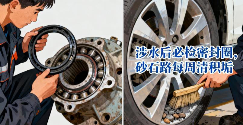 定期执行"抬轮三检法":每月将车轮悬空后检查异响、间隙、转动顺畅度,比盲从固定周期更可靠。当出现任一危险信号时,务必72小时内检修,避免引发轮毂脱落事故。