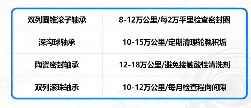 定期对车辆进行常规检查和保养,一旦发现异常及时处理,可以避免小问题演变成大故障,从而节省长期维修成本。轴承保养周期表
