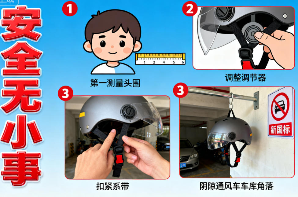 正确佩戴头盔的方法是“量、调、扣”:量好头围或试戴确定尺码;调整调节器;扣紧系带,确保下颚处留有一指空隙。