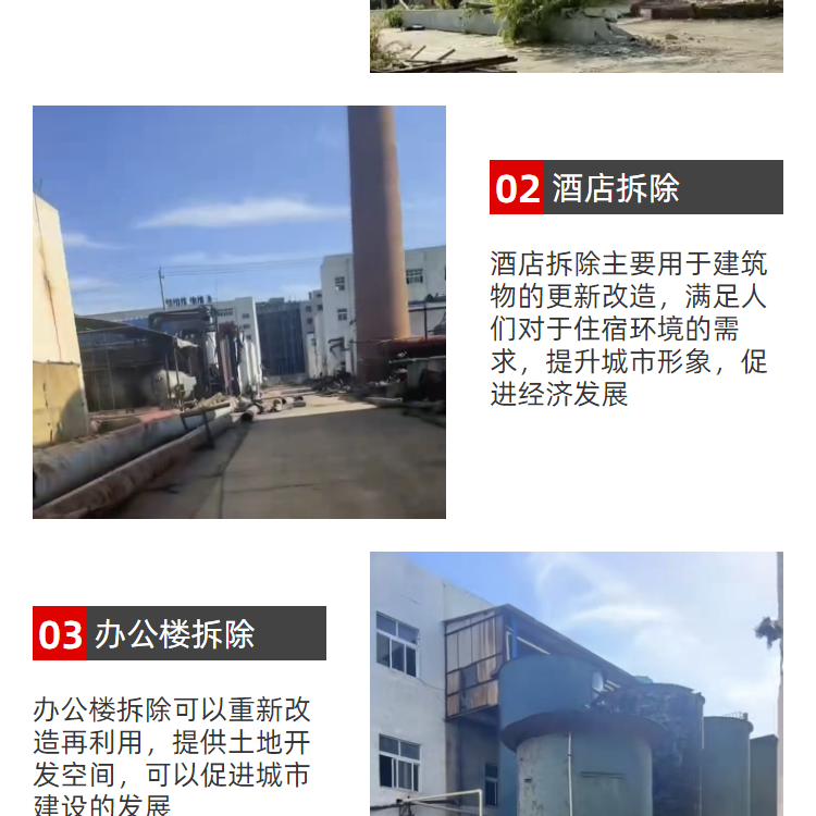 主营:拆除各工厂整体回收,钢结构厂房拆除回收,酒店拆除,高难度建筑拆除,高塔拆除,装潢装修室内外拆除